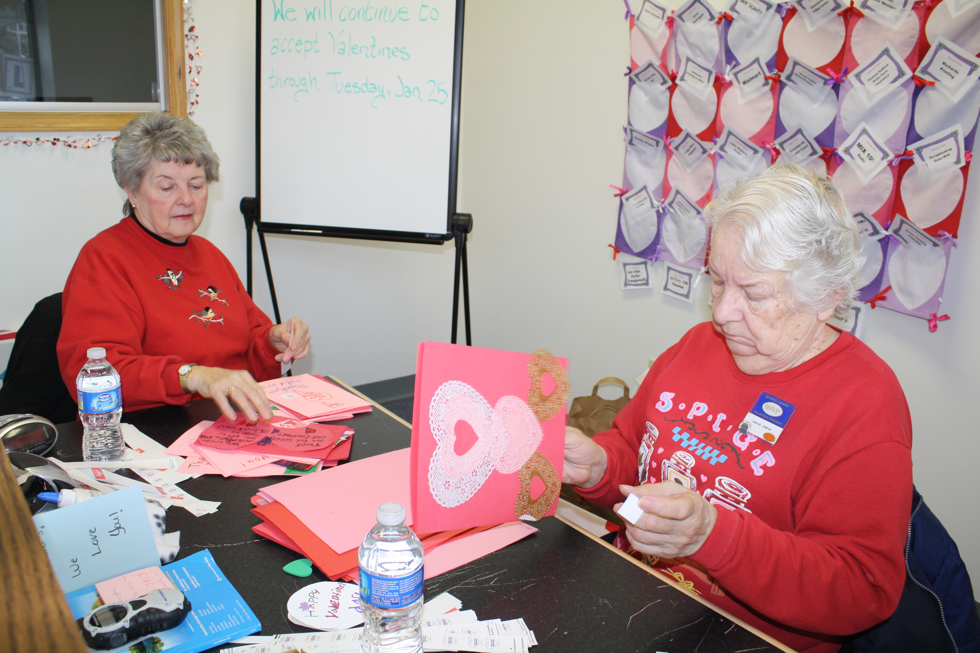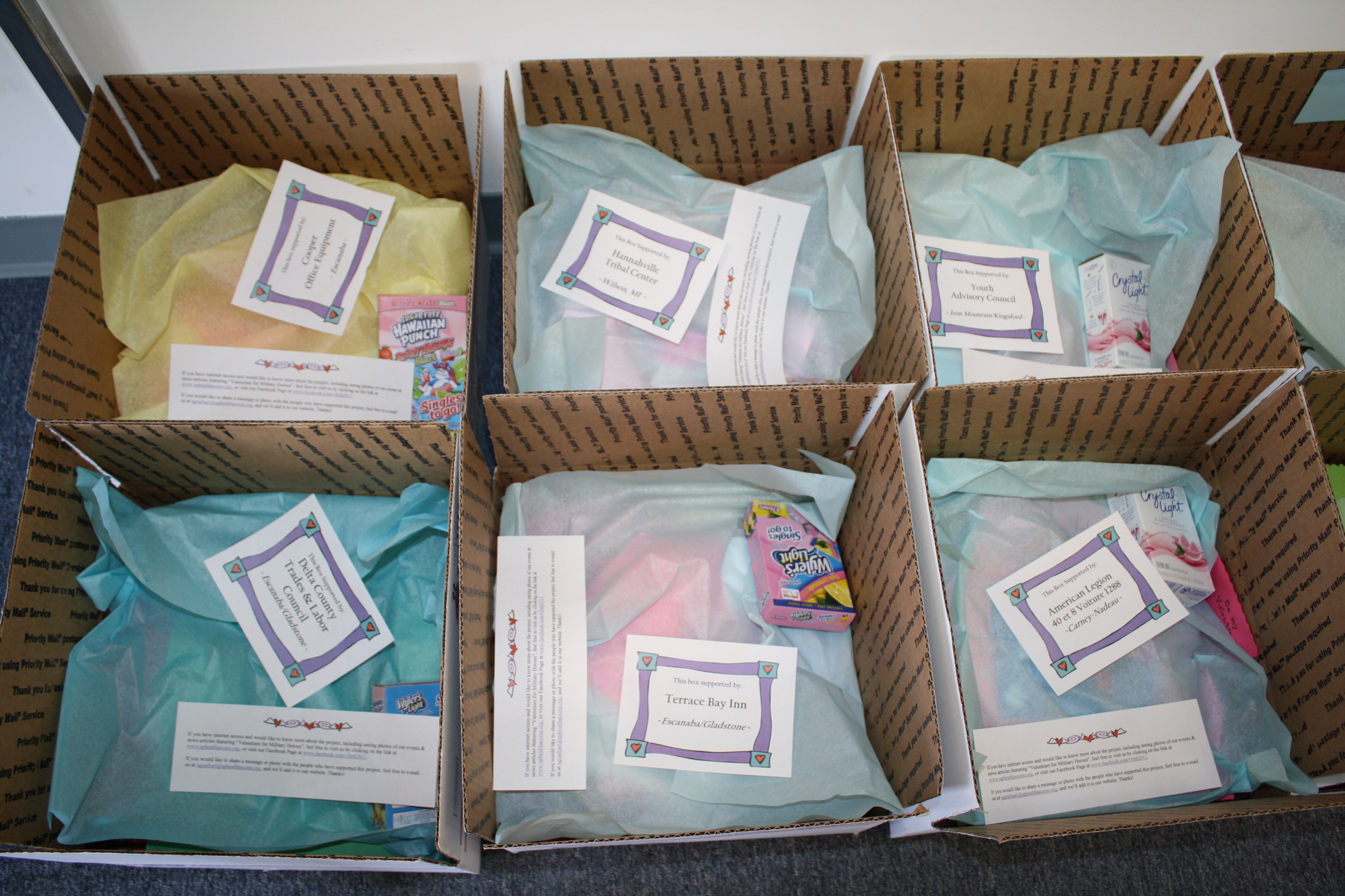 Colorful, creative Valentine submissions flooded in from schools, retirement homes, service organizations and churches in local project counties and six others (Chippewa, Luce, Mackinac, Marquette, Schoolcraft and Marinette, WI). Gearhart, a former news photographer, documented the project in photos for the web site. The team enlisted help of local Armory officers and military families to get addresses of service personnel to receive Valentine packages and solicited local businesses, service organizations and individuals (more than 2 dozen) to donate Valentine materials as well as to "adopt a box" as overseas package sponsors. They raised $1,400+ in cash/in-kind donations to make the project self-supporting. The team established a "Valentine Central" among a dozen drop-off locations for receiving Valentines and consulted postal staff for advice on packaging/shipping cards and powdered water-flavoring packets to soldiers.