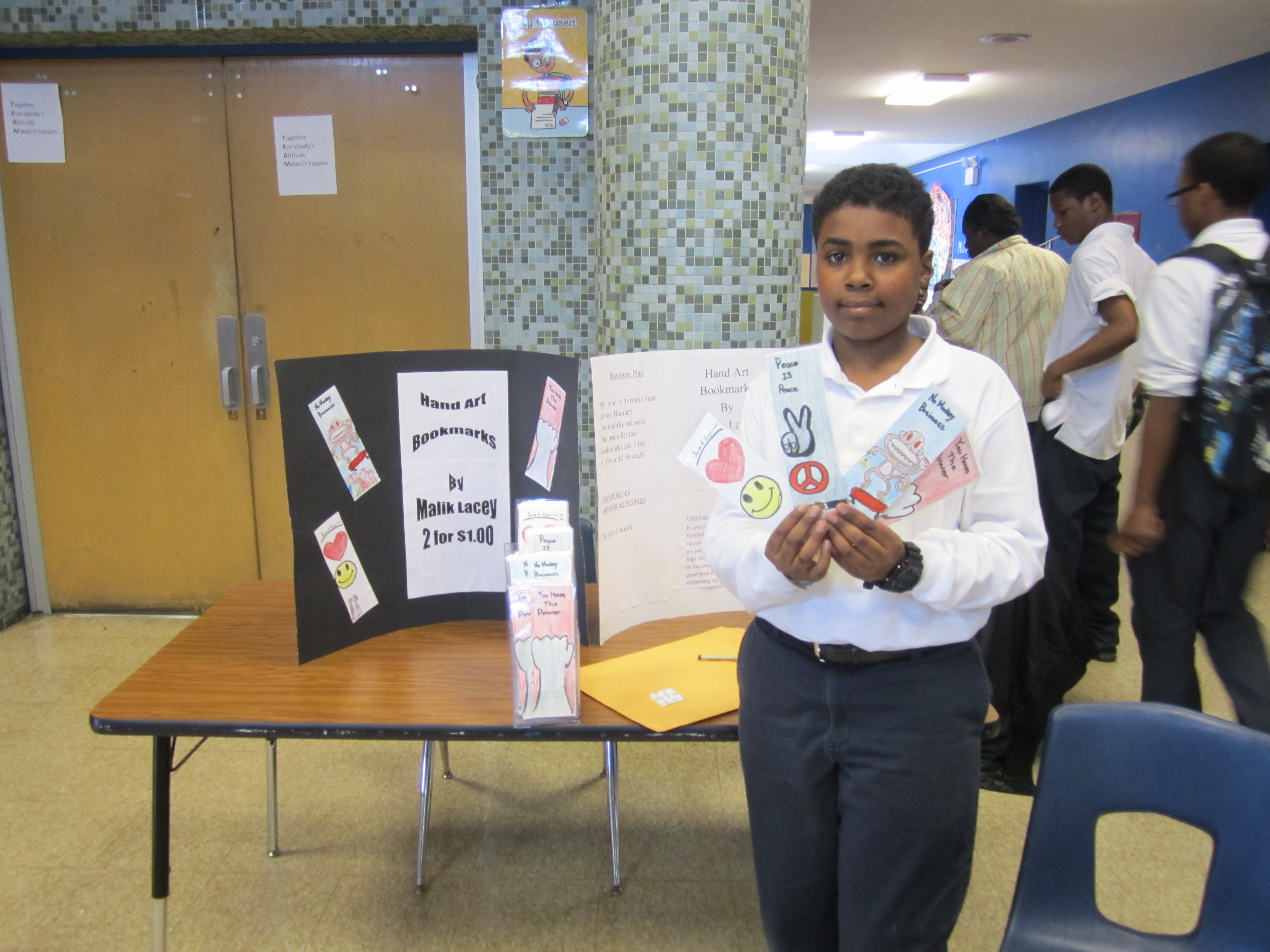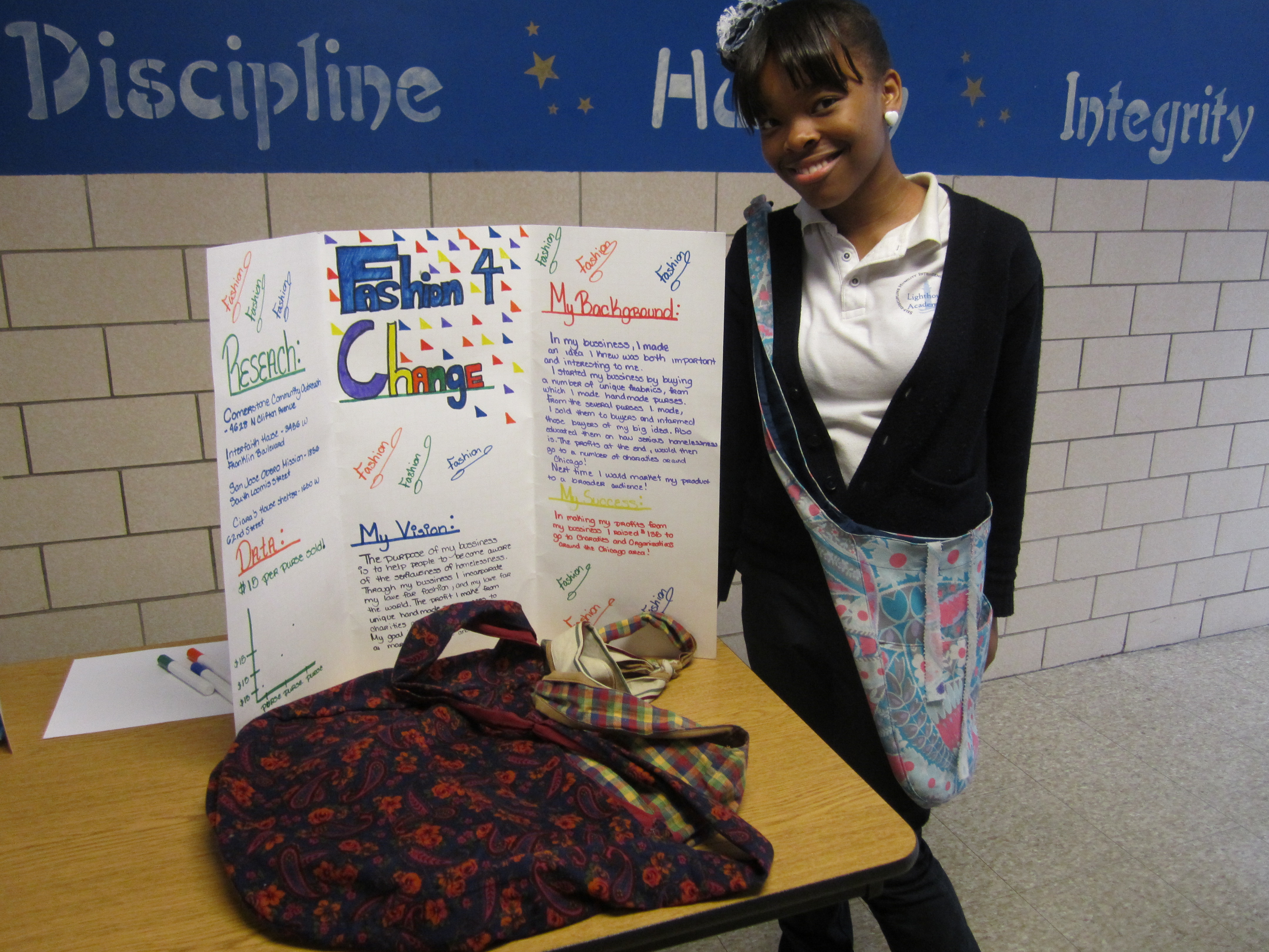 After a semester of business education, the Bronzeville students hosted an Entrepreneur Fair open to the community in which they sold everything from cookies to bracelets to homemade tutus. One student was even selling hand sewn purses for $15! She had sold 8 by the time I showed up. After one quick pass at the fair, the industrious students had exchanged the $9 in my pocket for their various wares. Their business models included standard businesses, fundraising for non-profits, and even social ventures.