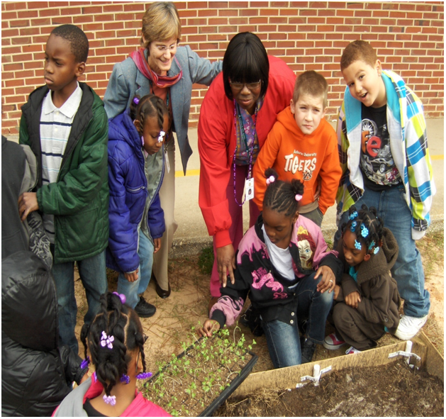 The children ages 5 through 10 learned age appropriate environmental stewardship in recycling, energy conservation, and plant and garden cycles. To further their literacy skills, they read books such as Adventures of a Plastic Bottle, From the Garden, and Dinosaurs Go Green. Parents were encouraged to become involved as the projects on water conservation and litter prevention were incorporated into homework activities and writing assignments. The gardens now yield such Southern delicacies as collards, okra, and tomatoes, which the students enjoy at the school, take home with them, and share with Manna.